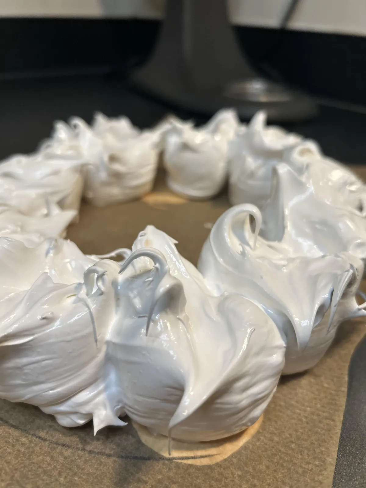 White Chocolate & Raspberry Meringue Christmas Wreath -delicate crisp meringue, tart raspberries, and festive flair.
